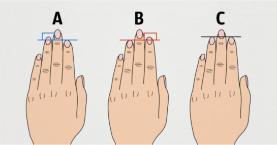 Pažiūrėkite į paveikslėlį. Nustatykite, kuris iš trijų variantų – A, B ar C – jūsų. Tikrinti reikia kairę ranką. 1. А – jūs mielas, bet...